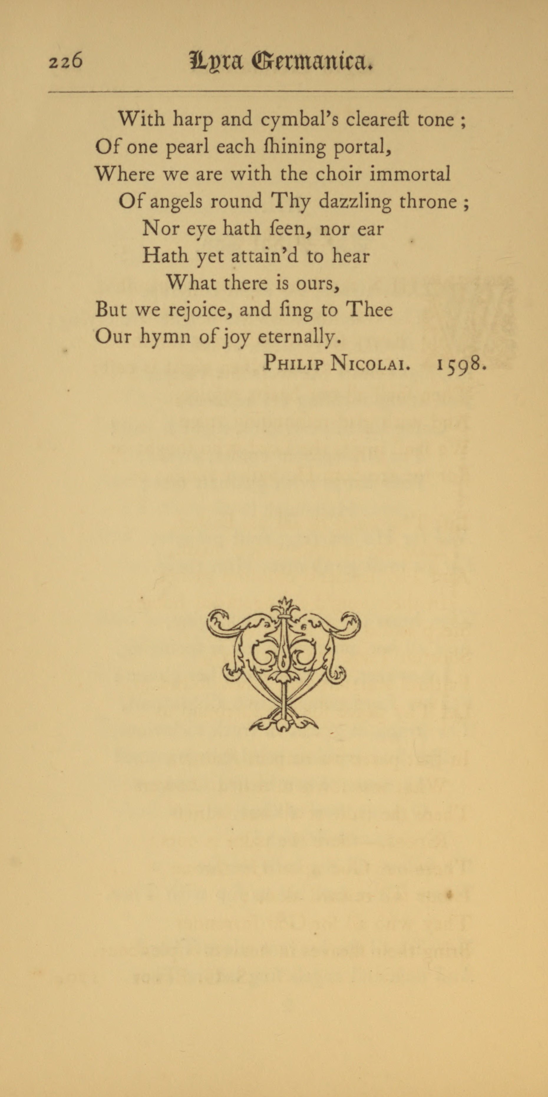 As yet most hymns were addressed to God the Father through our Lord Jesus Christ, or to the Holy Trinity, or in the case of hymns of sorrow and penitence to the Saviour. But afterwards the mystical union of Christ with the soul became a favourite subject; more secular allusions and similes were admitted, and a class of hymns begins to grow up, called in Germany “Hymns of the Love of Jesus.” Some of these are extremely beautiful, and express most vividly that sense of fellowship with Christ, of His presence and tender sympathy, of personal love and gratitude to Him, which are among the deepest and truest experiences of the Christian life; but it is a style which needs to be guarded, for it easily degenerates into sentimentality of a kind very injurious alike to true religion and poetical beauty. The earliest examples of this style are two celebrated hymns written by Dr. Philip Nicolai.[19]