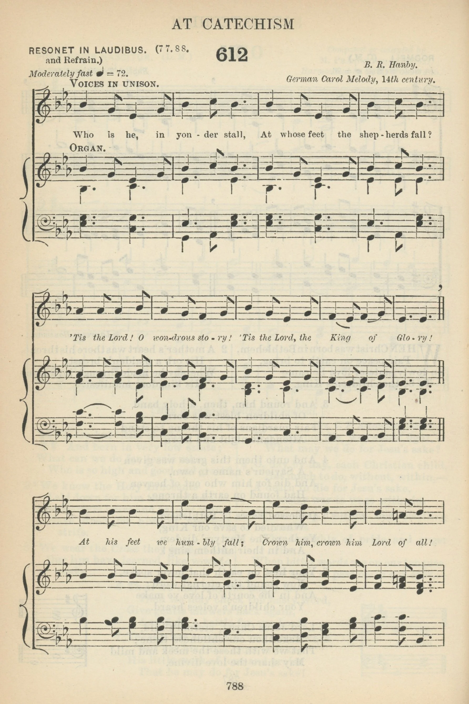 Hanby’s melody is primarily stepwise, with only a few leaps, not larger than a fourth, making it easily singable for congregations. The original harmonies are diatonic, using standard I – IV – V chords. Different names have been assigned to the original hymn tune. Several publications like The New Canadian Hymnal (1916) and Common Service Book of the Lutheran Church (1917) named the tune ADORATION. In some hymnals it was named LOWLINESS, such as in Gospel Melodies: A Collection of Choice Gospel Songs and Hymns (1918) and Bible School Hymnal (1907). The Baptist Hymnal (1991) and others use WHO IS HE.