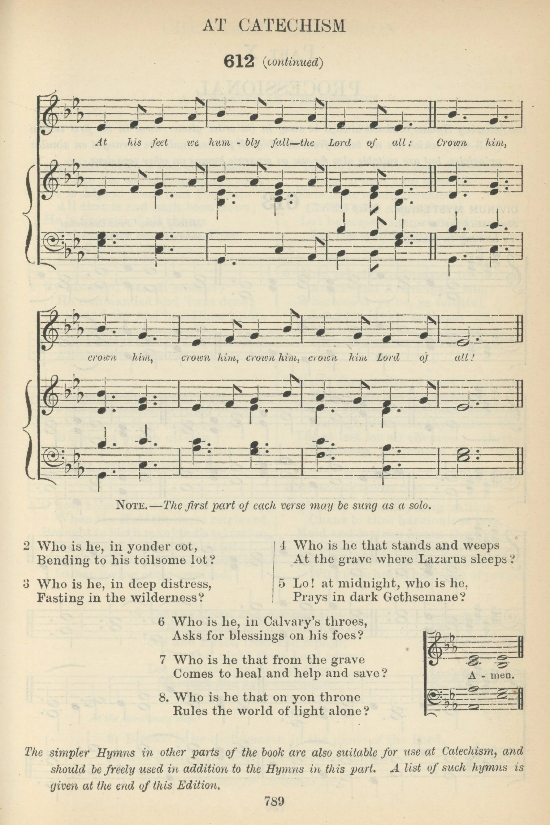 The hymnic meter is 7.7 plus 8.8.7.7 (refrain), trochaic. The rhyme scheme consists of rhyming couplets (including the refrain): aabbcc. The simplicity of the rhyme adds to the sense of the hymn being suitable for young children. The stanzas are narrative as well as interrogative. The chorus is declarative, with an emphatic tone, which is reinforced by the successive repetition of the words “’Tis the Lord,” which is called anaphora. Another poetic device, epizeuxis, is employed in the last line of the refrain, “Crown Him, Crown Him, Lord of All! The immediate repetition is for emphasis and urgency to worship the King of glory.