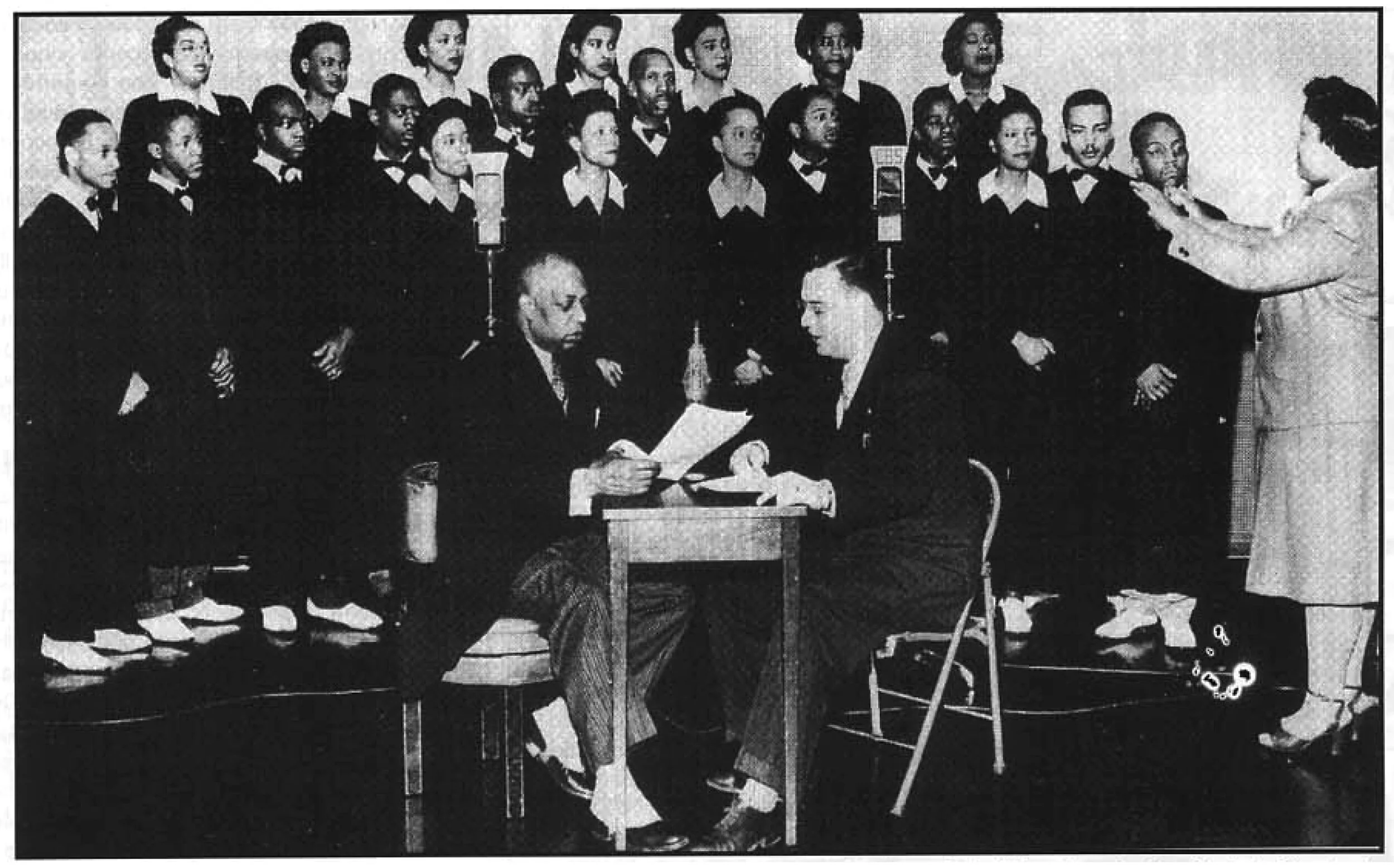 Wings Over Jordan, conducted by Hattye Easley. Photo by Franklin Photos. Rev. Glynn Settle, seated left, with announcer Reginald Merridew, ca. 1943–1945. Photo in the possession of Opal Louis Nations, reprinted in Blues & Rhythm (June 2001).